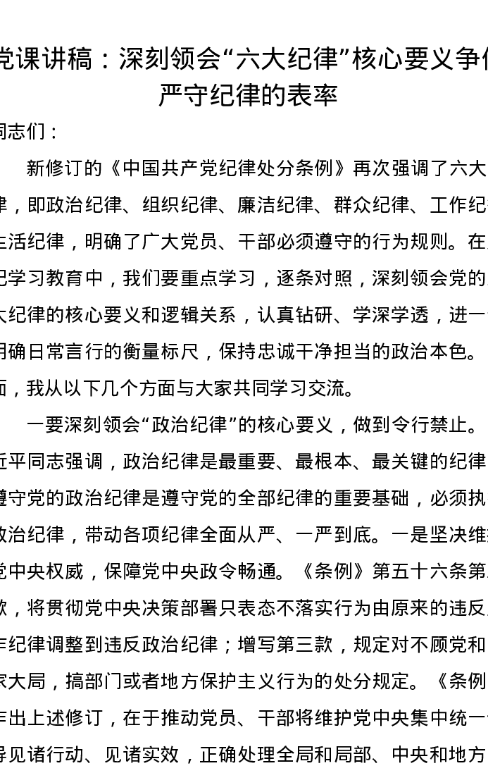 党课讲稿:深刻领会“六大纪律”核心要义争做严守纪律的表率