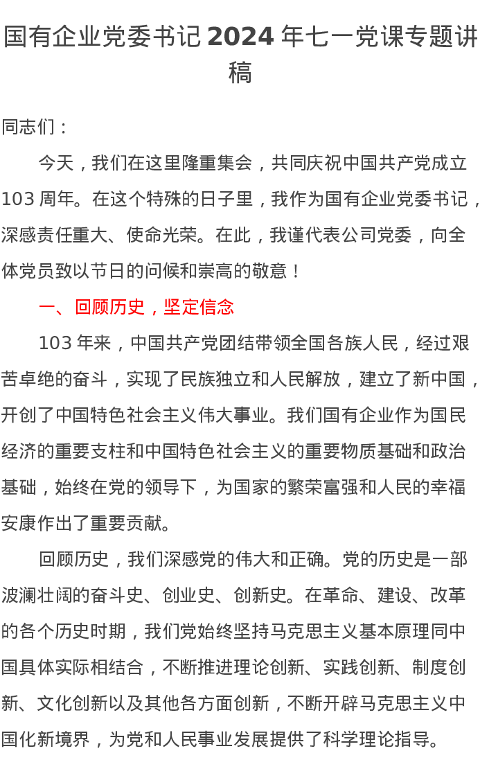 国有企业党委书记2024年七一党课专题讲稿