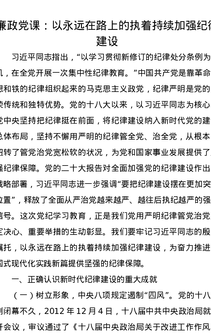 廉政党课讲稿:以永远在路上的执着持续加强纪律建设