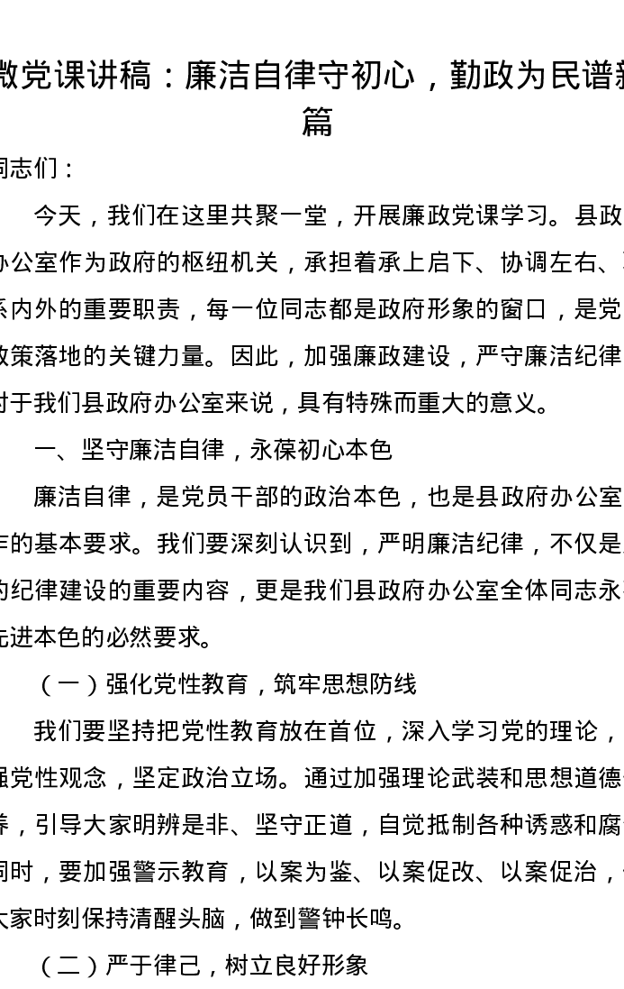 微党课讲稿:廉洁自律守初心,勤政为民谱新篇