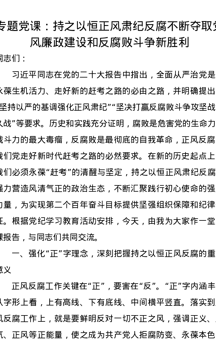 专题党课讲稿:持之以恒正风肃纪反腐不断夺取党风廉政建设和反腐败斗争新胜利
