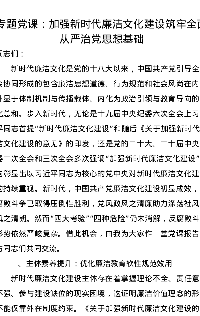 专题党课讲稿:加强新时代廉洁文化建设筑牢全面从严治党思想基础