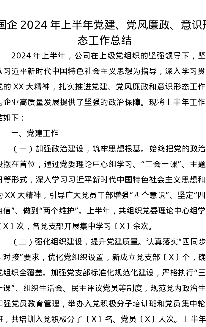 国企2024年上半年党建、党风廉政、意识形态工作总结