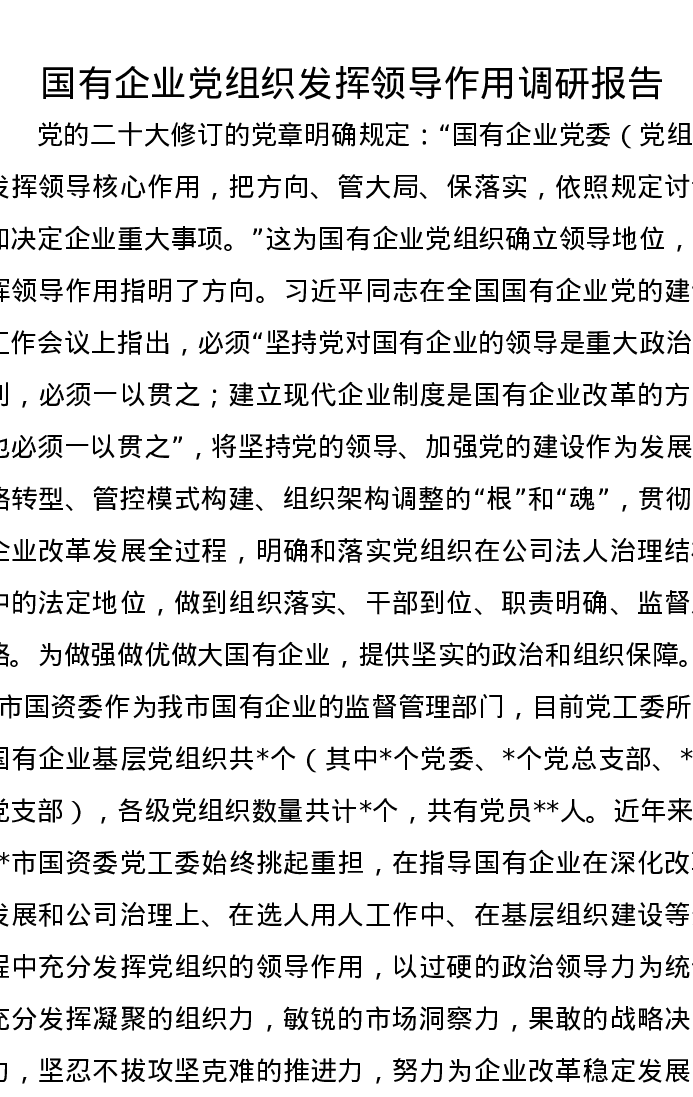 国有企业党组织发挥领导作用调研报告