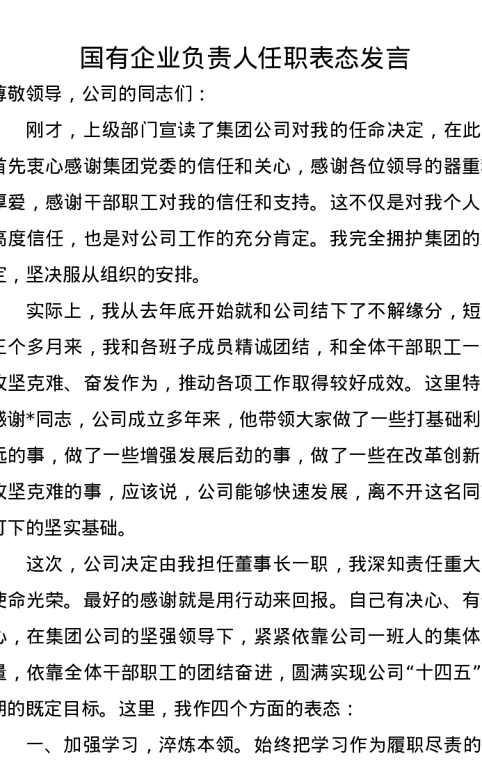 国有企业负责人任职表态发言