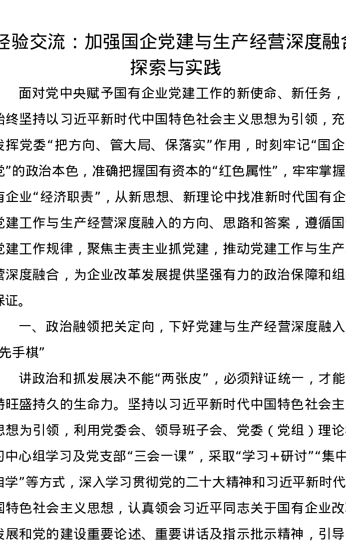 经验交流:加强国企党建与生产经营深度融合探索与实践