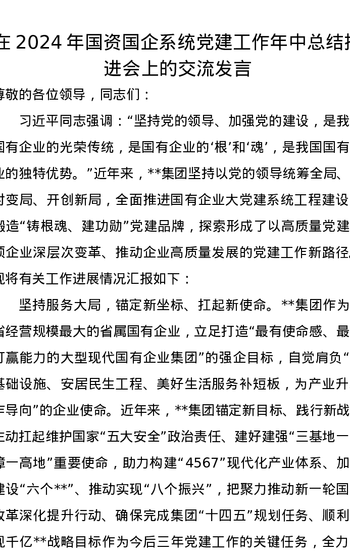 在2024年国资国企系统党建工作年中总结推进会上的交流发言