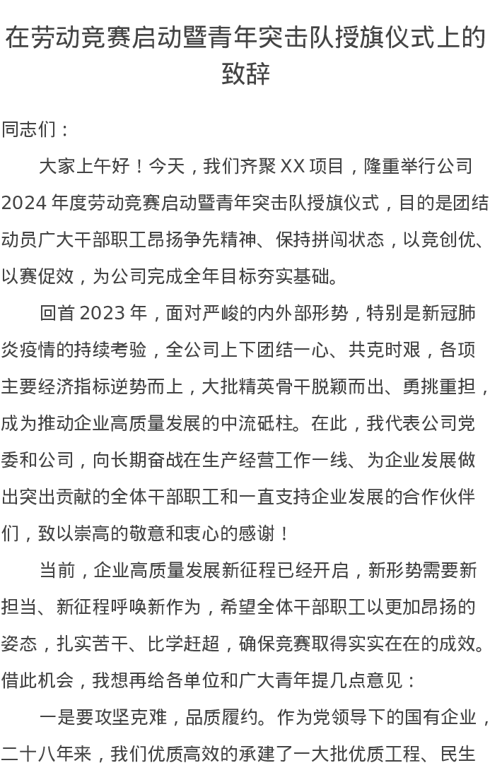 在劳动竞赛启动暨青年突击队授旗仪式上的致辞