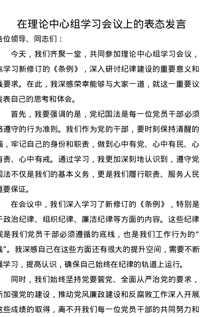 在理论中心组学习会议上的表态发言