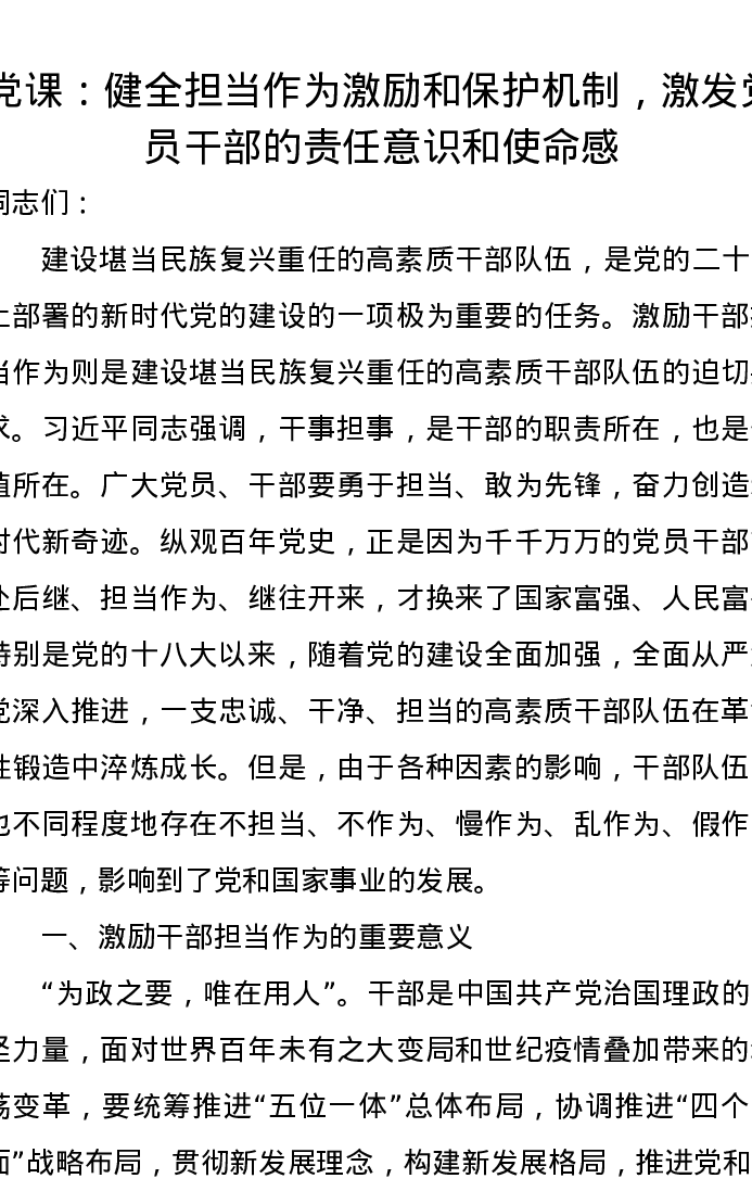 党课:健全担当作为激励和保护机制,激发党员干部的责任意识和使命感