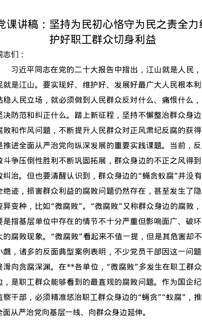 党课讲稿:坚持为民初心恪守为民之责全力维护好职工群众切身利益