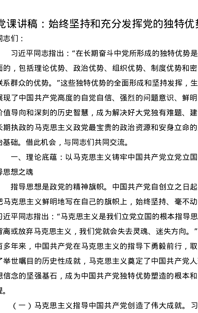 党课讲稿:始终坚持和充分发挥党的独特优势