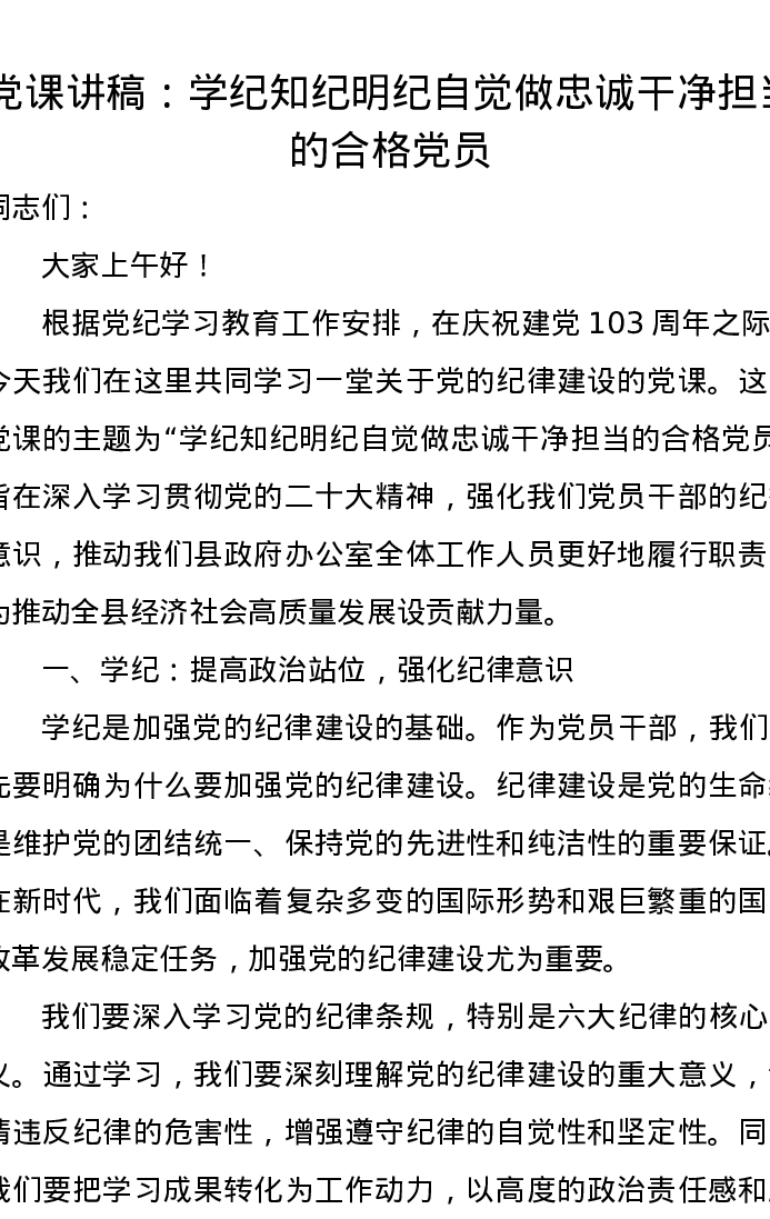 党课讲稿:学纪知纪明纪自觉做忠诚干净担当的合格党员