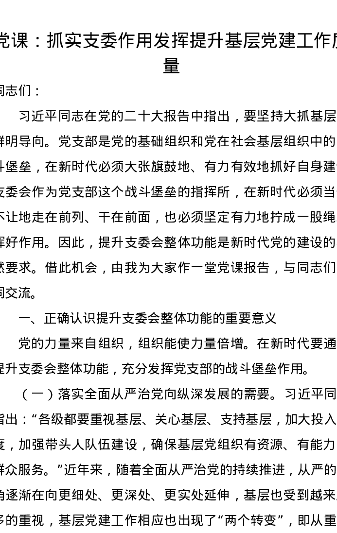 党课讲稿:抓实支委作用发挥提升基层党建工作质量