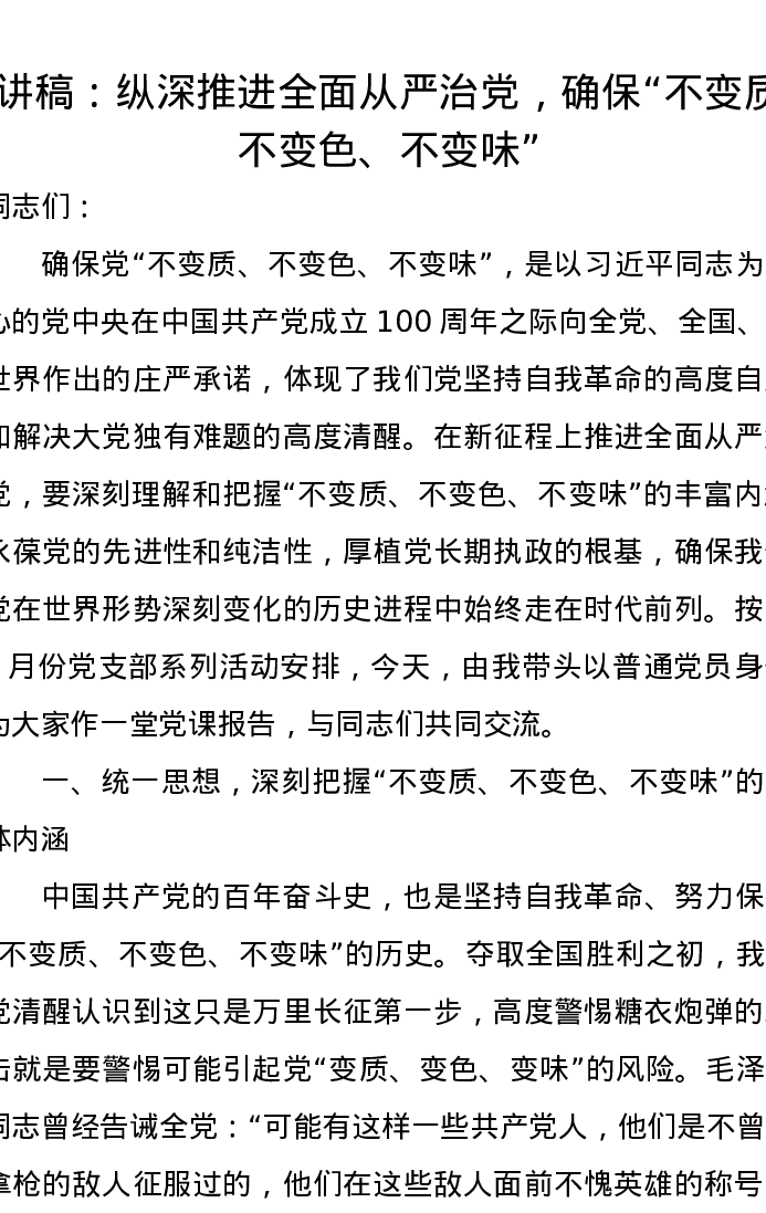 讲稿:纵深推进全面从严治党,确保“不变质、不变色、不变味”