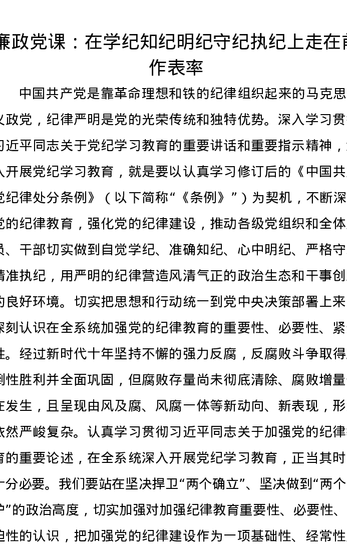 廉政党课讲稿:在学纪知纪明纪守纪执纪上走在前作表率