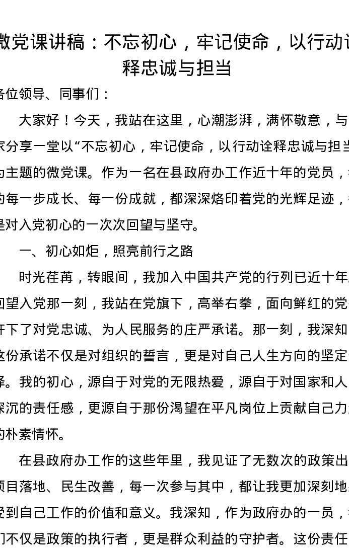 微党课讲稿:不忘初心,牢记使命,以行动诠释忠诚与担当