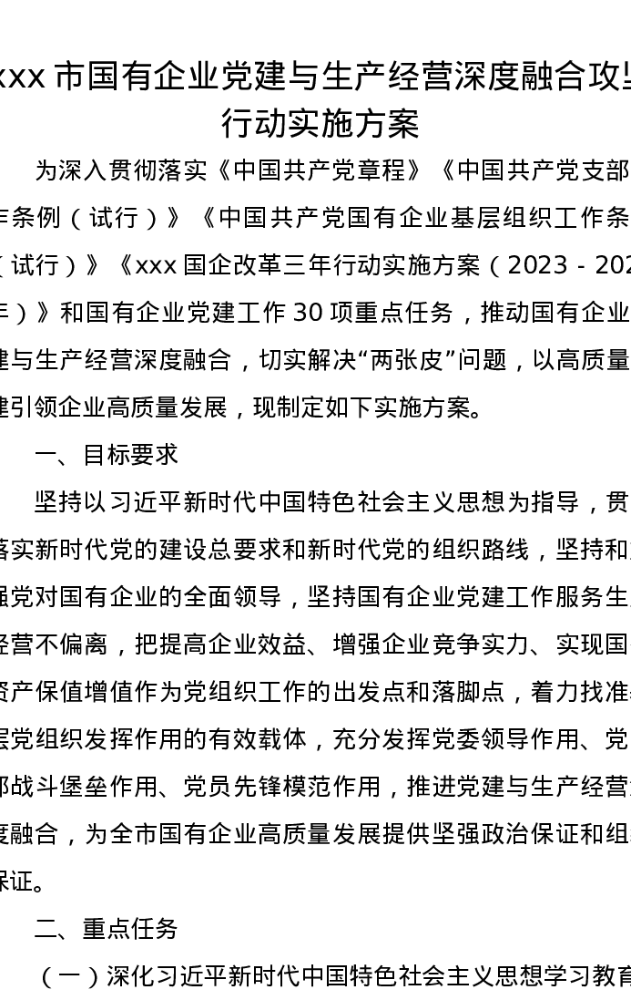 xxx市国有企业党建与生产经营深度融合攻坚行动实施方案