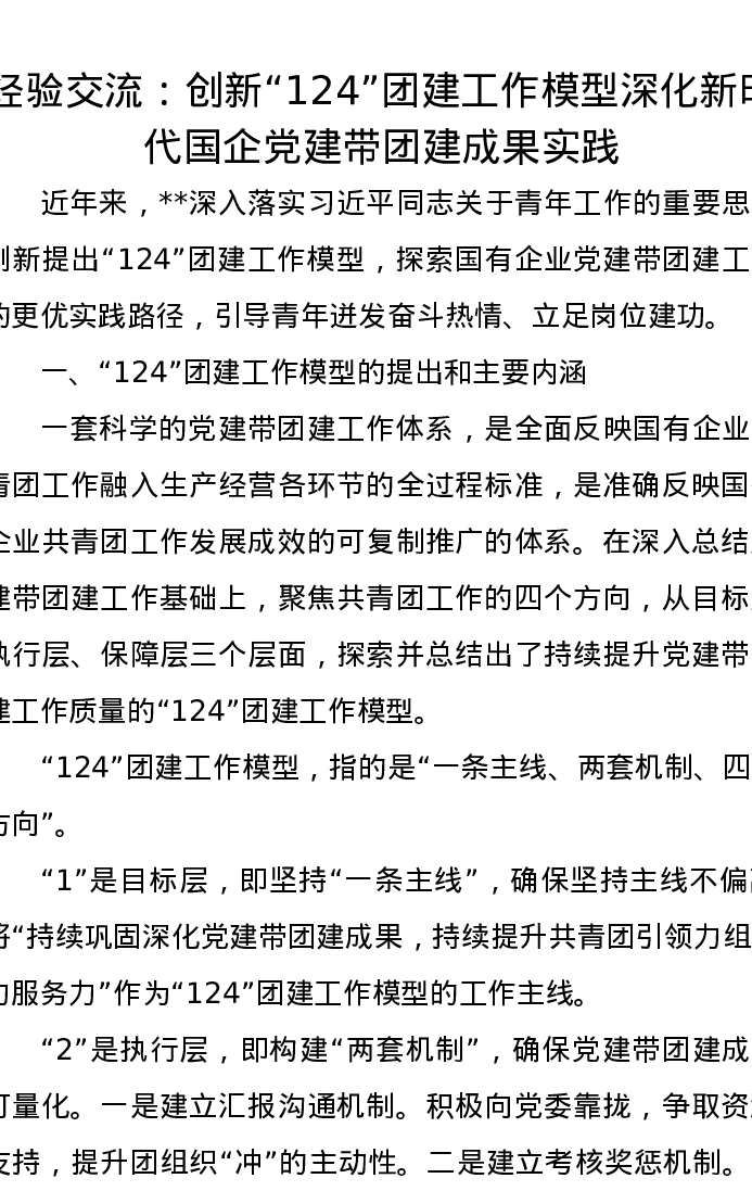 经验交流:创新“124”团建工作模型深化新时代国企党建带团建成果实践