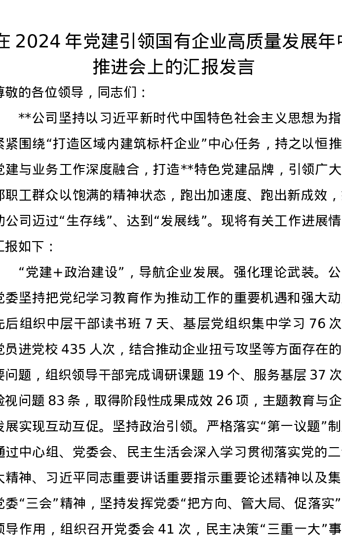 在2024年党建引领国有企业高质量发展年中推进会上的汇报发言