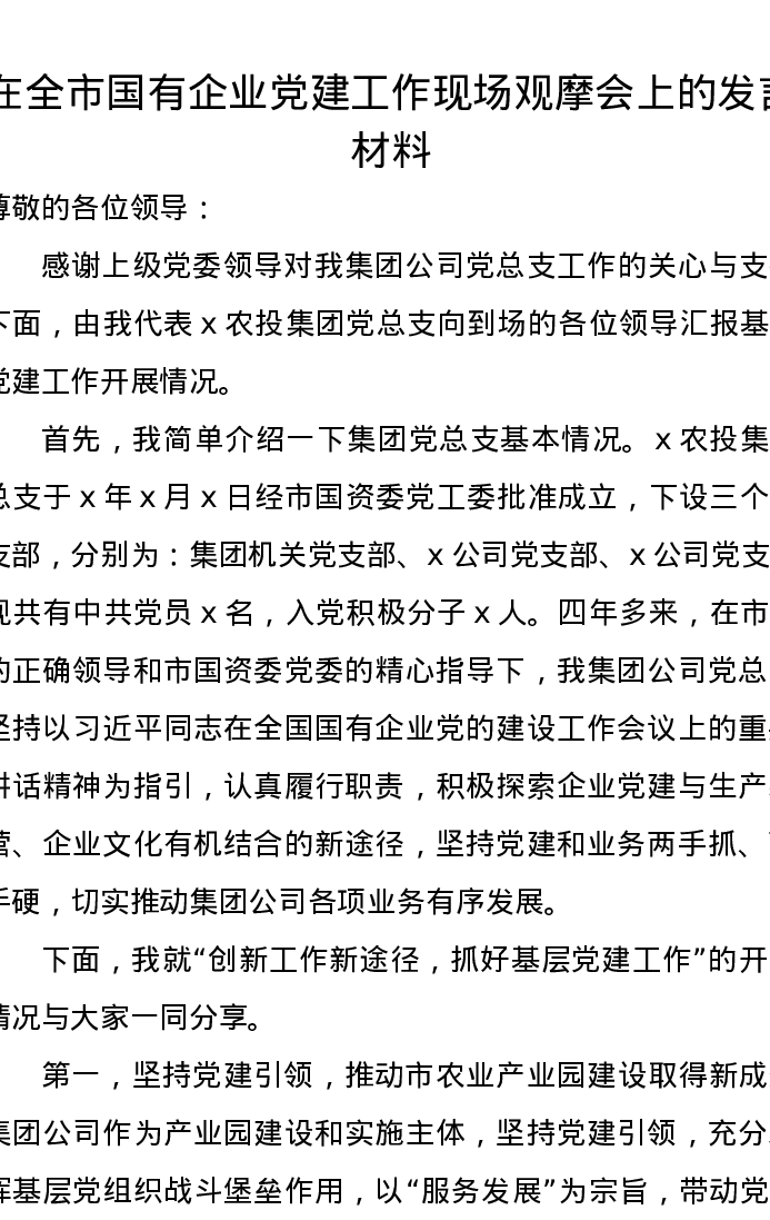 在全市国有企业党建工作现场观摩会上的发言材料
