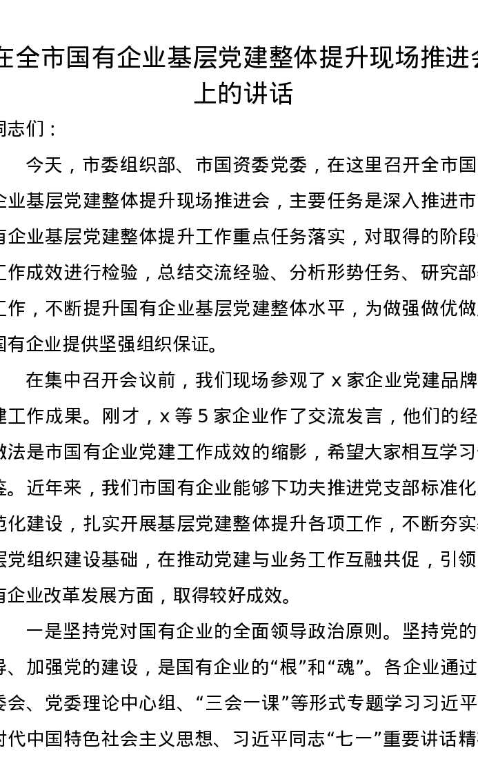 在全市国有企业基层党建整体提升现场推进会上的讲话