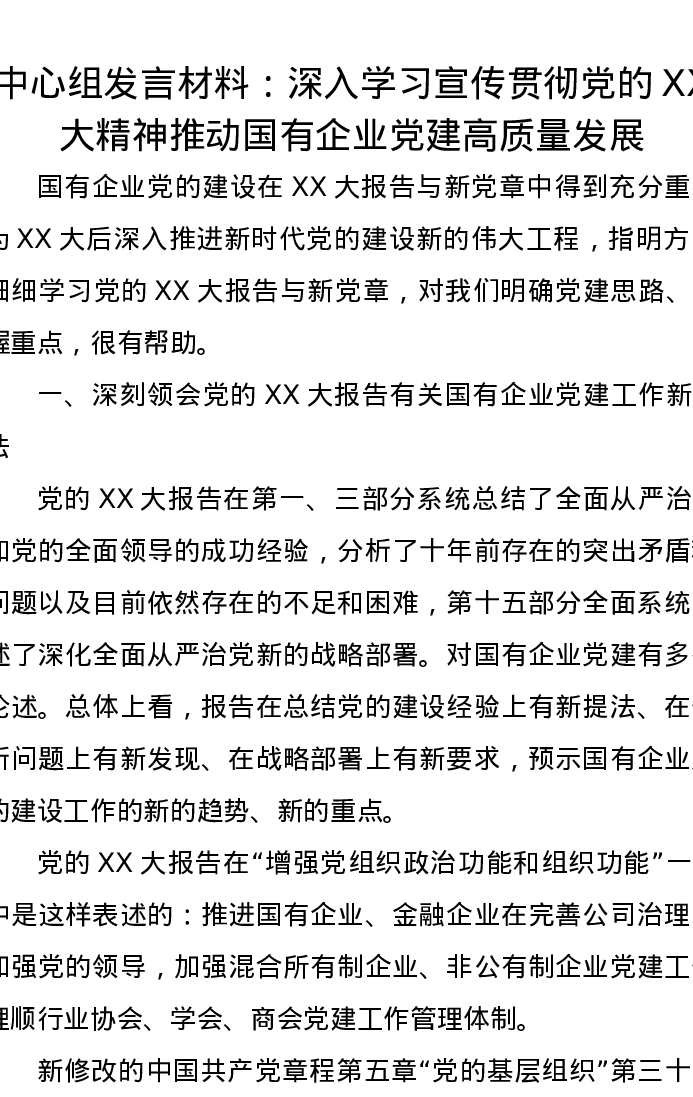 中心组发言材料:深入学习宣传贯彻党的XX大精神推动国有企业党建高质量发展
