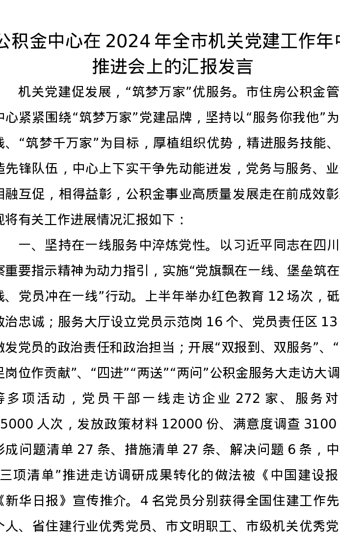 公积金中心在2024年全市机关党建工作年中推进会上的汇报发言