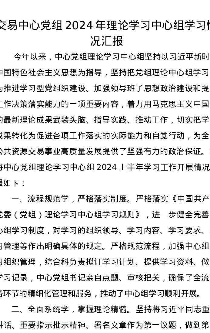 交易中心党组2024年理论学习中心组学习情况汇报