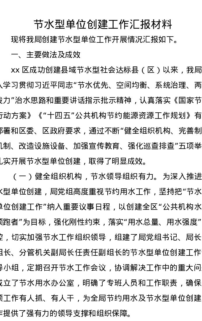 节水型单位创建工作汇报材料