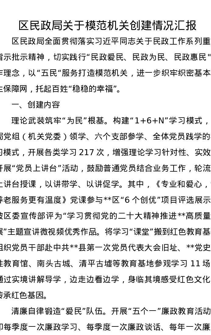 区民政局关于模范机关创建情况汇报