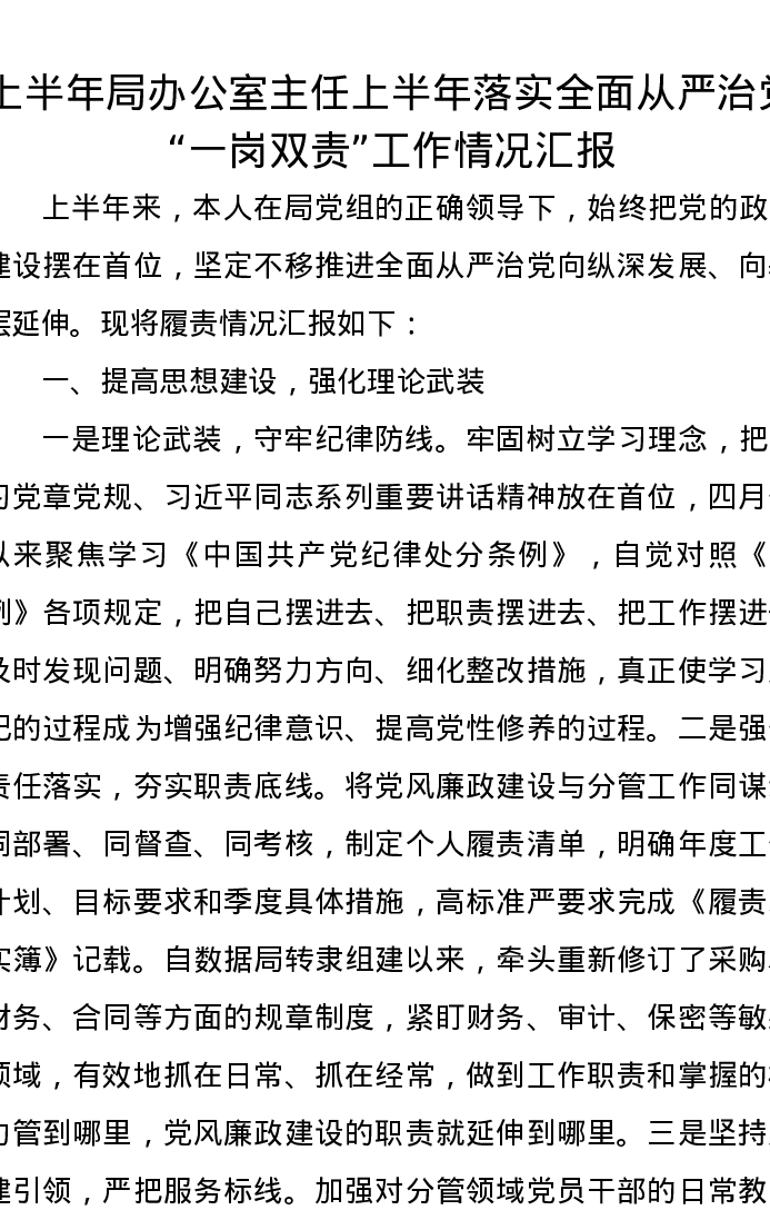 上半年局办公室主任上半年落实全面从严治党“一岗双责”工作情况汇报