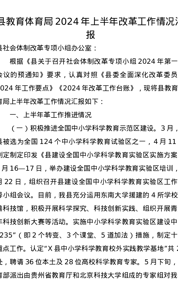 县教育体育局2024年上半年改革工作情况汇报