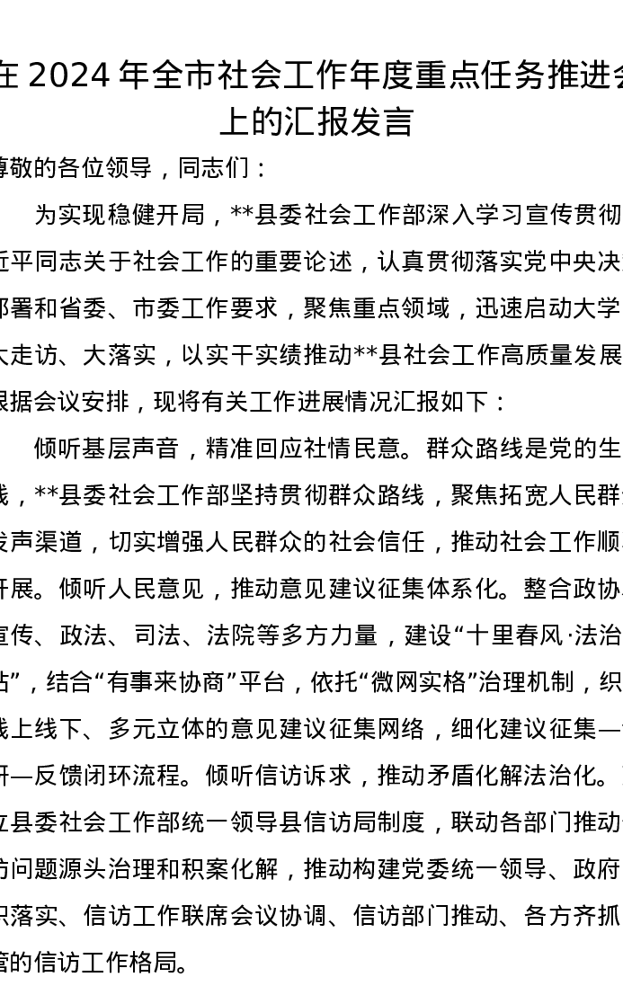 在2024年全市社会工作年度重点任务推进会上的汇报发言