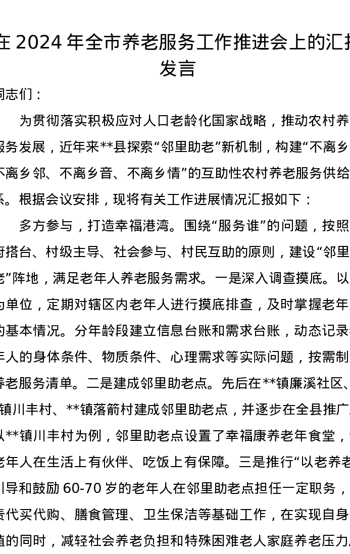 在2024年全市养老服务工作推进会上的汇报发言