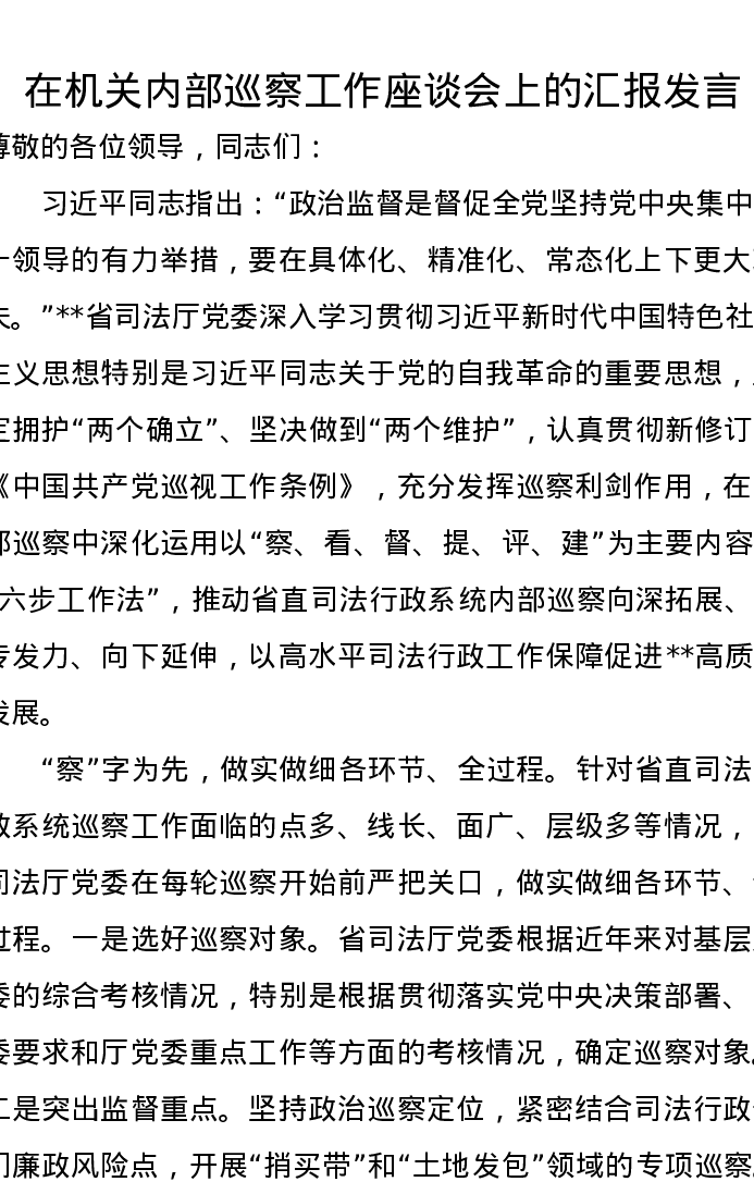 在机关内部巡察工作座谈会上的汇报发言