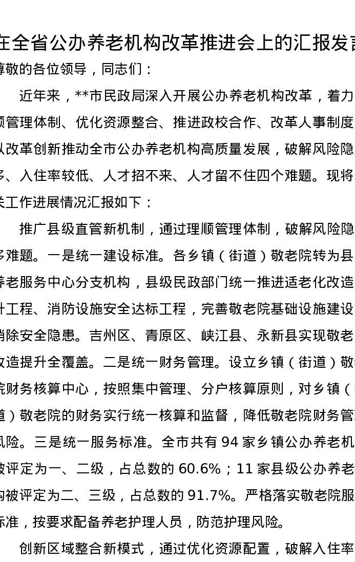 在全省公办养老机构改革推进会上的汇报发言