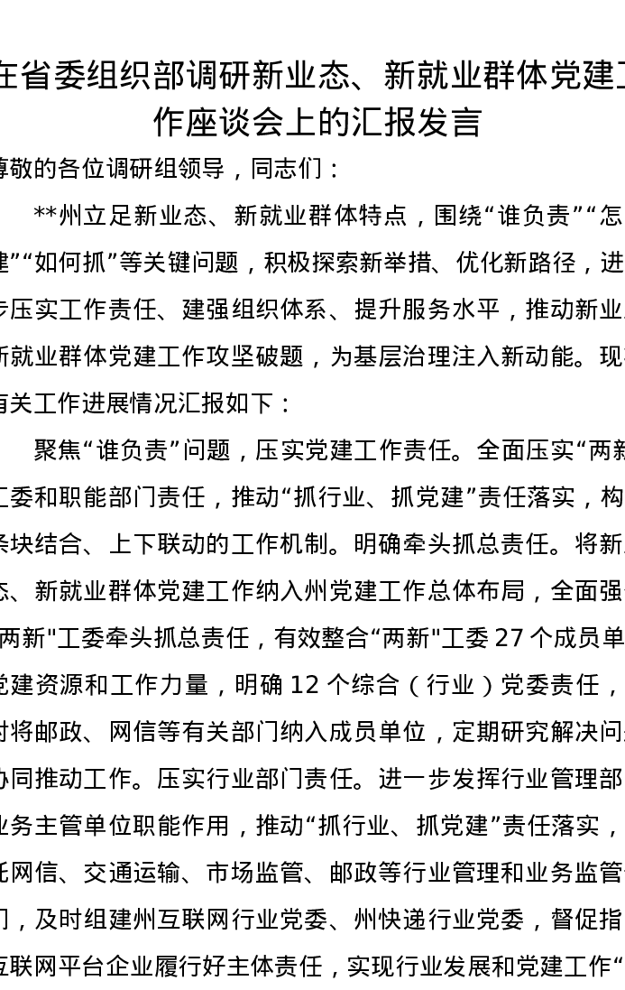 在省委组织部调研新业态、新就业群体党建工作座谈会上的汇报发言
