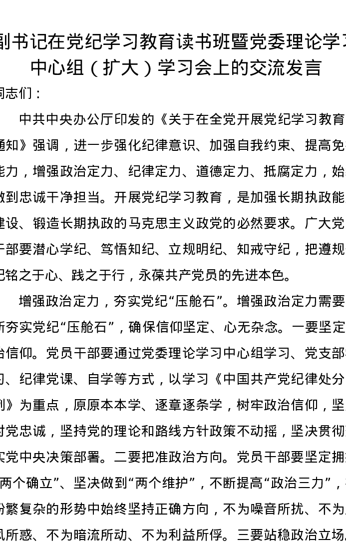 副书记在党纪学习教育读书班暨党委理论学习中心组(扩大)学习会上的交流发言