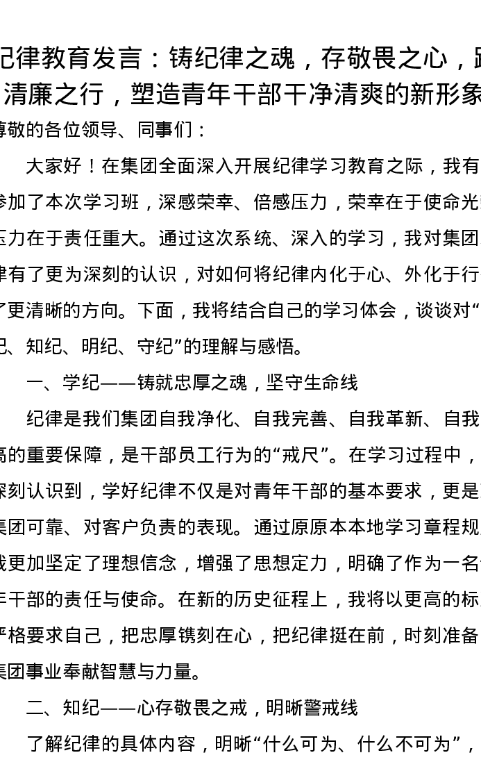 纪律教育发言:铸纪律之魂,存敬畏之心,践清廉之行,塑造青年干部干净清爽的新形象