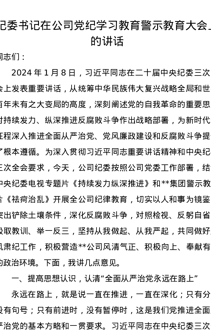 纪委书记在公司党纪学习教育警示教育大会上的讲话