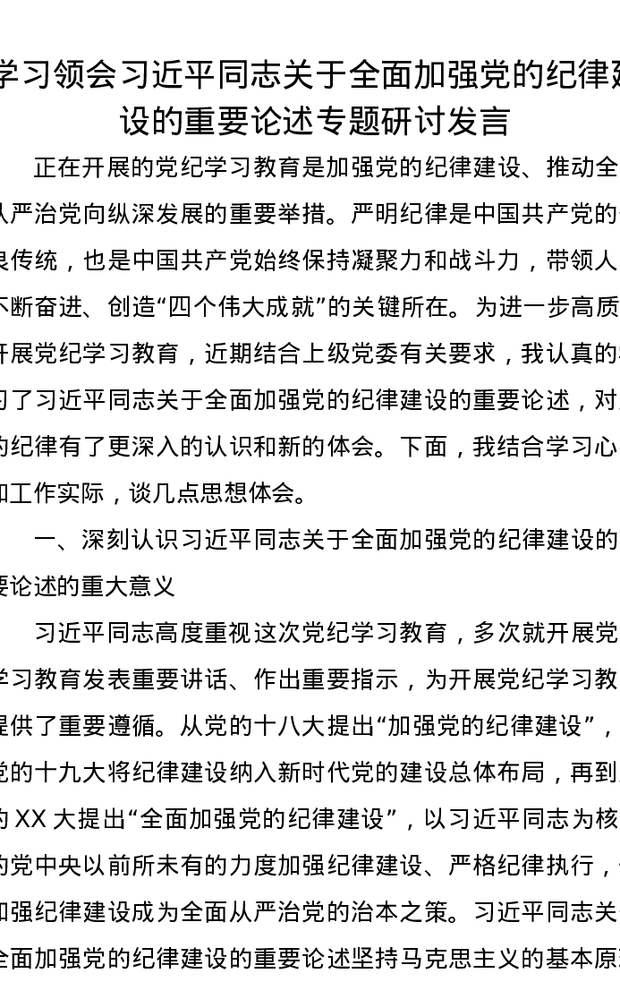 学习领会关于全面加强党的纪律建设的重要论述专题研讨发言