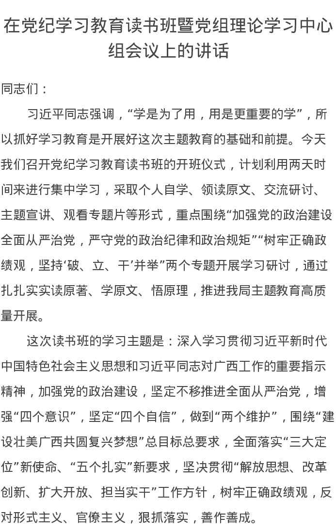 在党纪学习教育读书班暨党组理论学习中心组会议上的讲话