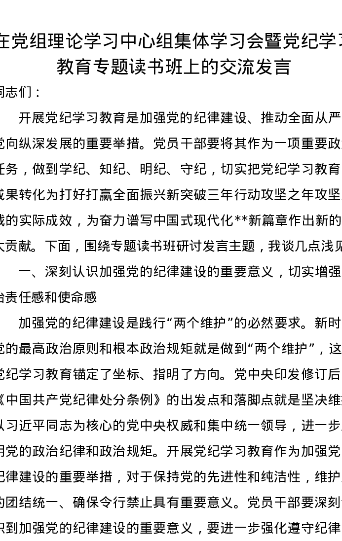 在党组理论学习中心组集体学习会暨党纪学习教育专题读书班上的交流发言