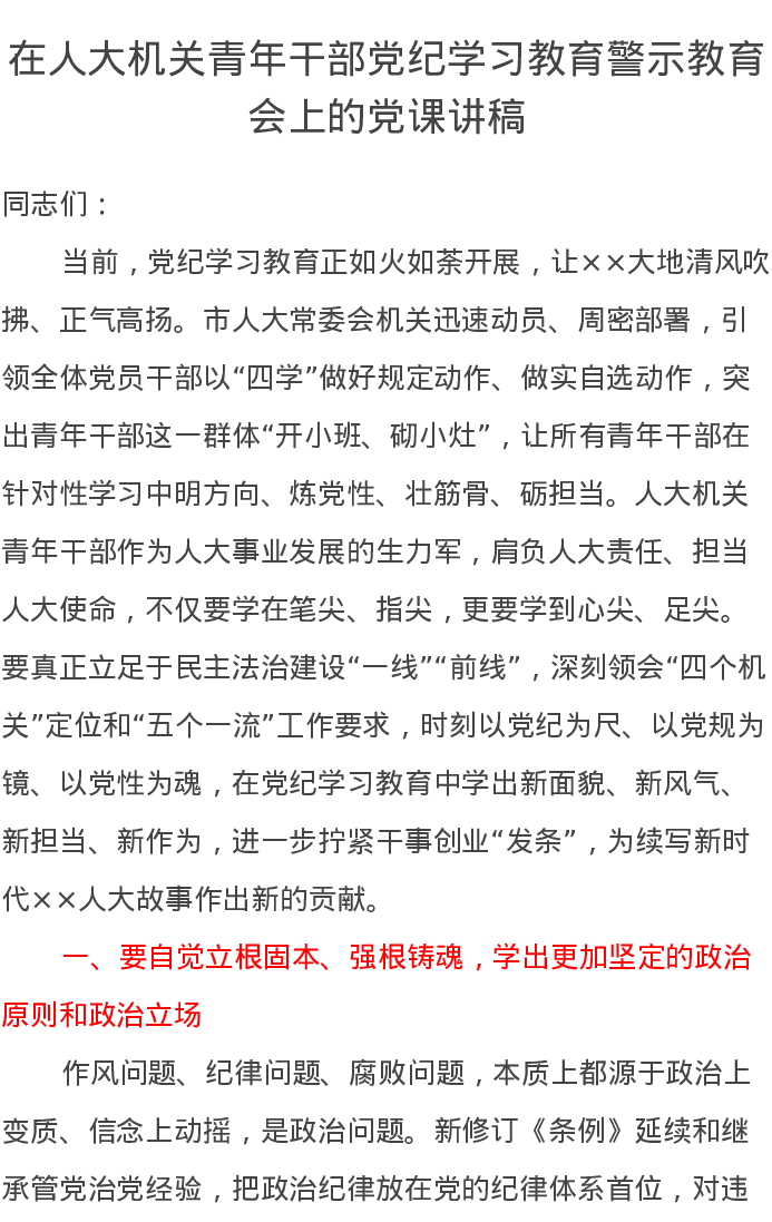 在人大机关青年干部党纪学习教育警示教育会上的党课讲稿