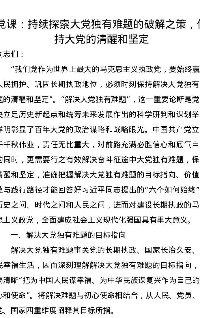 党课讲稿:持续探索大党独有难题的破解之策,保持大党的清醒和坚定