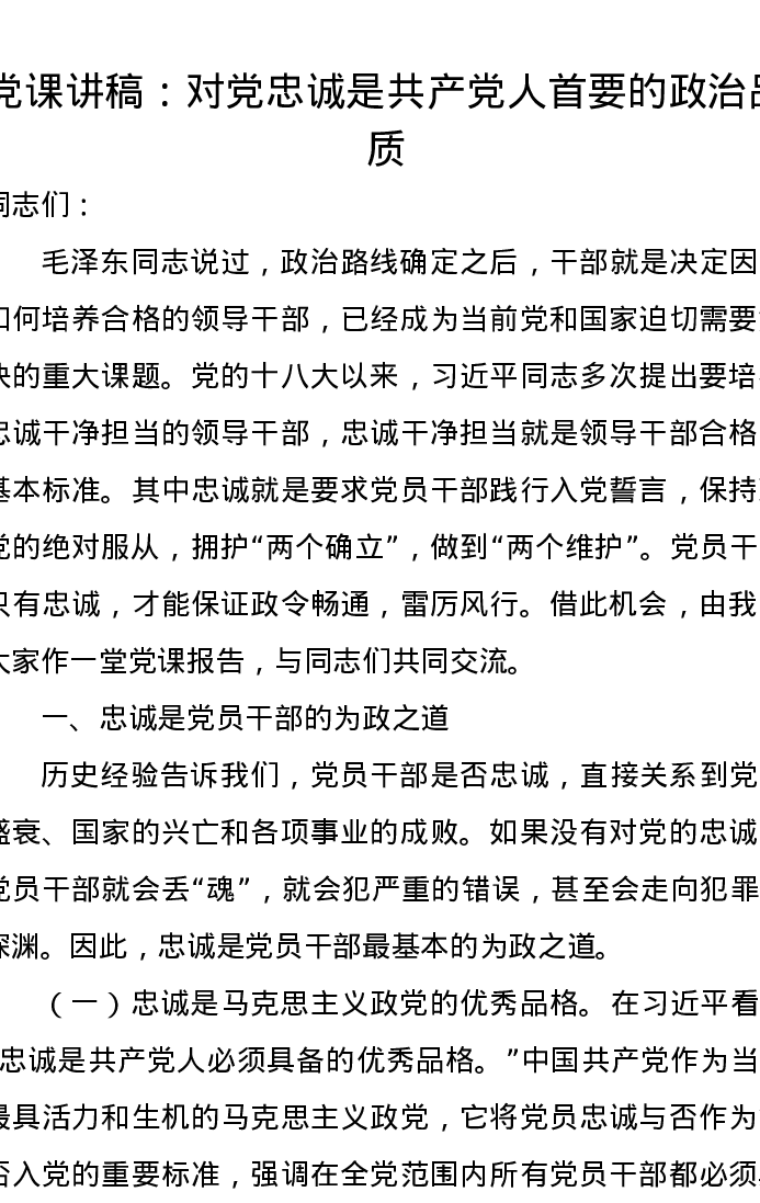 党课讲稿:对党忠诚是共产党人首要的政治品质