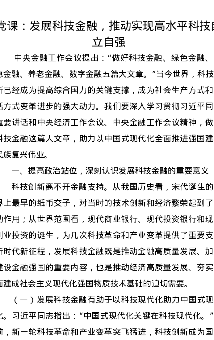 党课讲稿:发展科技金融,推动实现高水平科技自立自强