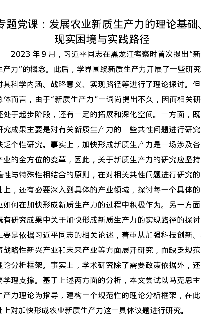 党课讲稿:发展农业新质生产力的理论基础、现实困境与实践路径