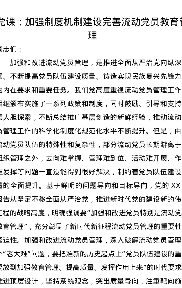 党课讲稿:加强制度机制建设完善流动党员教育管理